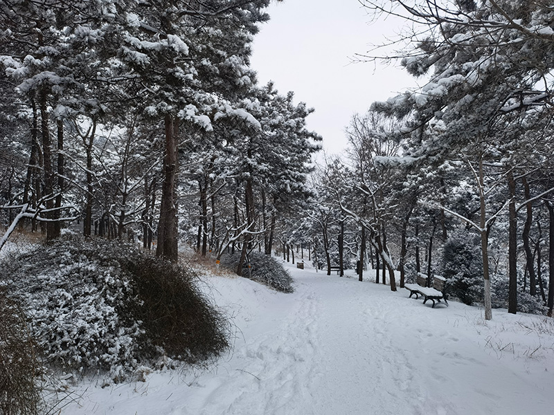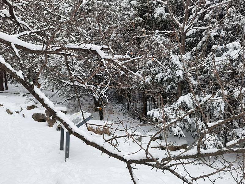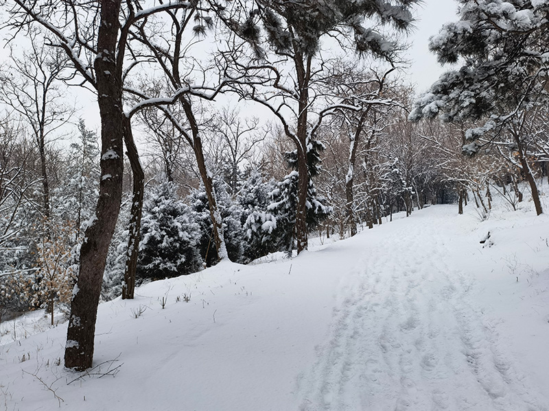 遠(yuǎn)看百望山的雪,好像并不大,山色斑駁,并沒有呈現(xiàn)出白皚皚的景色。這點(diǎn)與故鄉(xiāng)的雪景也是大為不同。故鄉(xiāng)的冬天,山上的樹葉大多不落,加之雨夾雪的反復(fù)作用,樹枝和樹葉上會(huì)有一層厚厚的冰,晶瑩剔透,遠(yuǎn)看近觀,宛如瓊林仙境一般,如夢(mèng)如幻。當(dāng)最后拋雪下來時(shí),整個(gè)山林白皚皚一片,即使遠(yuǎn)遠(yuǎn)望去,也是滿山的白雪,再也不見樹木的顏色。而這里需要到近處才能感覺到它的妙處,原來地上還是有厚厚的一層積雪,山溝處有齊腿的深度,樹林深處,深邃而整潔,完全沒有往日的雜亂。