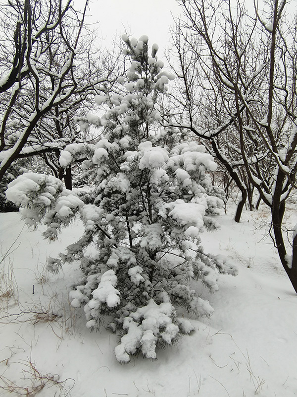 百望山的樹木很多,但一多半是落葉的喬木,只山腳下有一小部分松樹等有葉子的林子。雪落在光禿禿的樹上,自然只有很少一部分保留了下來,一旦大風(fēng)吹過,就所剩無幾了。所以,在北京看雪景,要找有成片松樹的地方,才能看到雪的真容和奇妙。即使是很小的松樹,樹葉上也堆滿了雪花,厚厚的一層,晶瑩剔透,充滿了無限生機(jī)。百望山的松樹不少,因此這里成了賞雪絕好的去處。