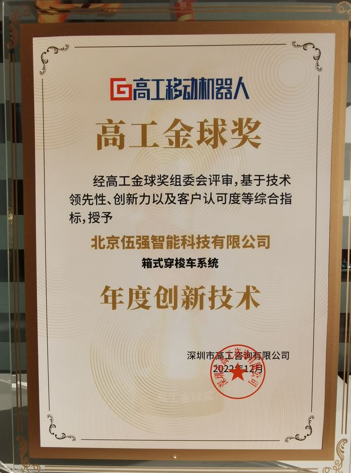 在頒獎晚宴現(xiàn)場,大會公布了高工金球獎獲獎企業(yè)名單,伍強智能科技憑借箱式穿梭車系統(tǒng),榮獲2022高工金球獎——年度創(chuàng)新技術(shù)。