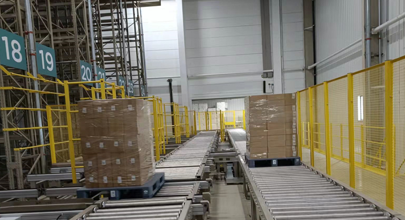 采用輸送機(jī)布局,是大多數(shù)立體庫的首選。這一技術(shù)具有集放能力強(qiáng)、效率高、故障率低、安全可靠等特點。但對于巷道數(shù)很多的情況,輸送機(jī)有一個限制是輸送能力問題,一般情況下,對于150托盤/小時以內(nèi)流量來說,輸送機(jī)是一個比較合適的選擇。但更大的流量則要考慮分區(qū)作業(yè),或采用其它方法。輸送機(jī)方案的另一個缺點是剛性太大,不易擴(kuò)展。