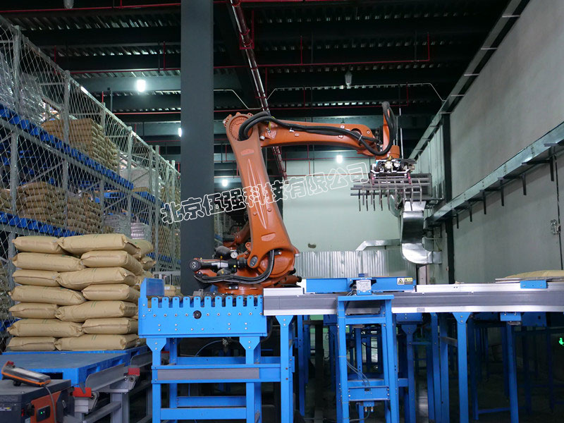 2) 機(jī)器人碼垛系統(tǒng):4臺(tái)機(jī)械手(兩臺(tái)用于原料入庫(kù)碼垛,兩臺(tái)用于成品入庫(kù)碼垛);